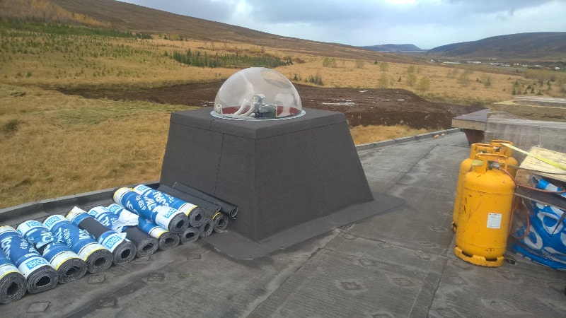 Outside the building during the construction phase.