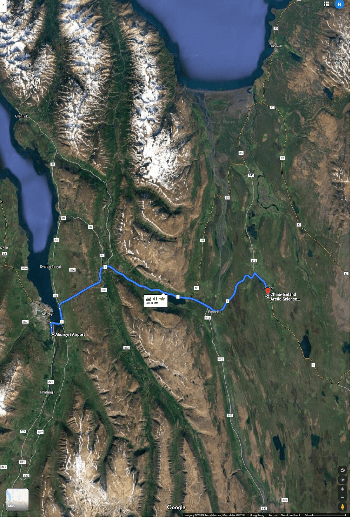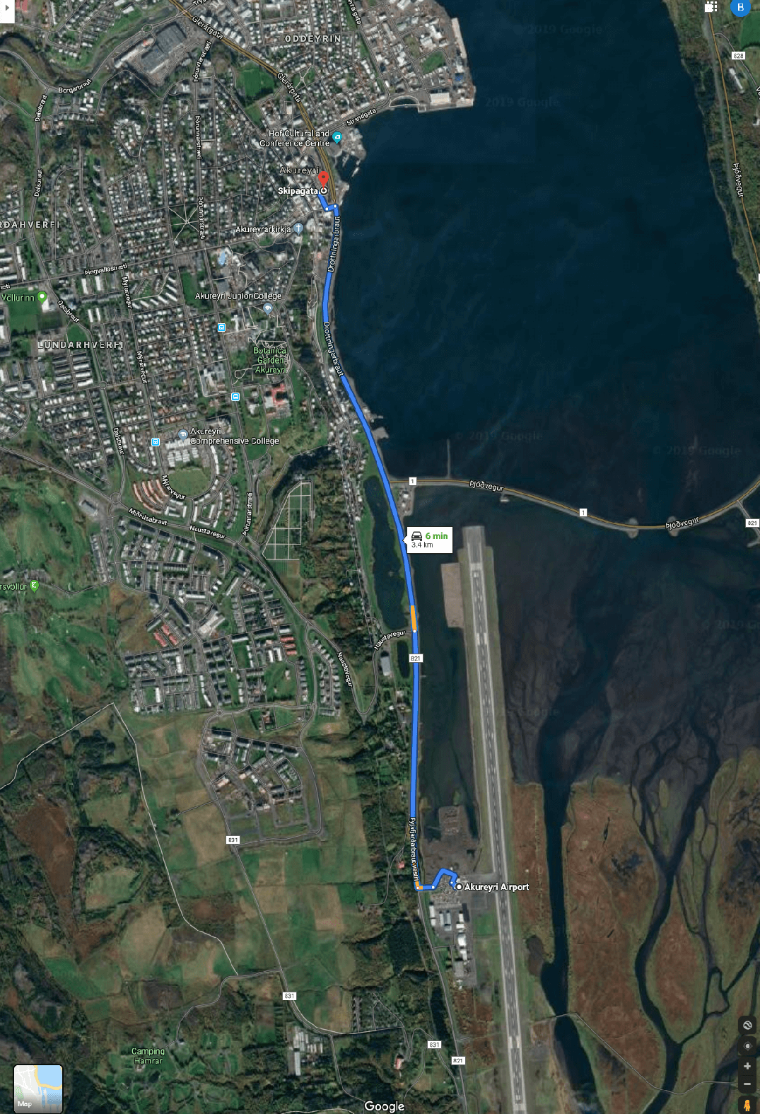 These maps show the route from Akureyri to the CIAO station, the area around the CIAO station, and the route from Akureyri Airport to the town center.